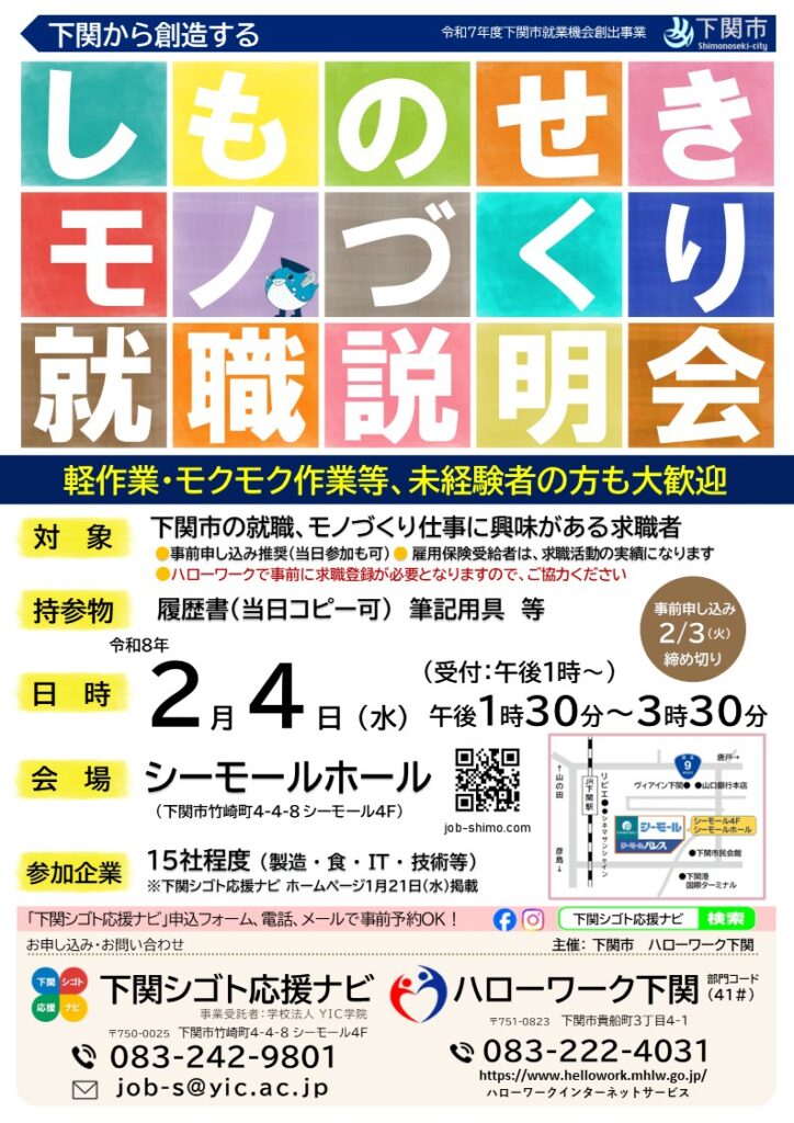 対 象:下関市内でモノづくり企業への就職を希望する求職者
